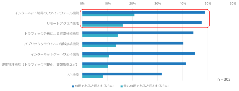 今回の調査では、WANの利用企業は、WANのオプション機能について、インターネット境界のファイアウォール機能やリモートアクセス機能を有用であると考えていることが分かりました。WANのオプション機能について、最も有用であると思われる項目についてみると、「インターネット境界のファイアウォール機能」の回答割合が最も高く20%を超えており、「リモートアクセス機能」が15%程度で続いています。在宅勤務の広がりに伴い、WANのユーザー企業は、オプション機能にも、在宅勤務環境の構築に役立つ機能を求めています。