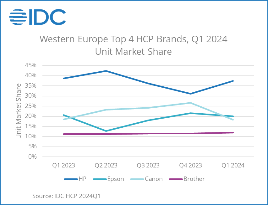 In Q1 2024, HP remained the top market leader with a share of 37.4%. Brother has seen an increase in its market share to 12.1%, while Canon and Epson have maintained their market shares despite declining shipments.