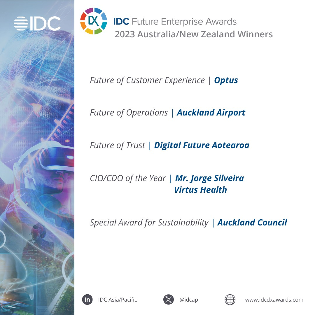 SYDNEY, AUSTRALIA / AUCKLAND, NEW ZEALAND, 18 October 2023 – IDC announced Jorge Silveira of Virtus Health as CIO/CDO of the Year in the Australia and New Zealand IDC Future Enterprise Awards (FEA) 2023. Auckland Airport, Auckland Council, Digital Future Aotearoa and Optus were also named as winners in different categories.