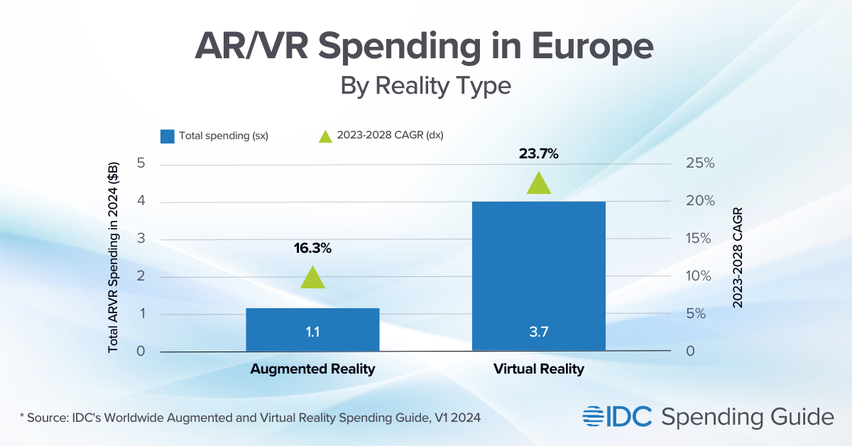 MILAN, May 13, 2024 — According to the Worldwide Augmented and Virtual Reality Spending Guide published by International Data Corporation (IDC), European augmented reality and virtual reality (AR/VR) spending will reach $4.8 billion in 2024. AR/VR spending will record a 21.9% compound annual growth rate (CAGR) over the next five years to reach $10.2 billion in 2028. Stronger-than-expected growth is driven by increased spending for VR following the launch of new devices on the European market.