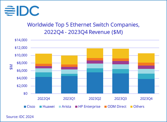NEEDHAM, Mass., March 8, 2024 – The worldwide Ethernet switch revenues grew 20.1% year over year in 2023 to $44.2 billion. In the fourth quarter of 2023 (4Q23) the Ethernet switch market grew 0.8%. The total worldwide enterprise and service provider (SP) router market recorded $16.4 billion in revenue in 2023, a year-over-year decline of 0.4%. The router market also saw a year-over-year decline of 12.7% in 4Q23. These results were recently published in the International Data Corporation (IDC) Worldwide Quarterly Ethernet Switch Tracker and the Worldwide Quarterly Router Tracker.