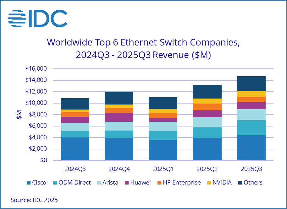 NEEDHAM, Mass., December 11, 2025 – The worldwide Ethernet switch market recorded $14.7 billion in revenue in the third quarter of 2025 (3Q25), a 35.2% year-over-year (YoY) increase, fueled by strong growth in the datacenter portion of the market as hyperscalers and cloud service providers race to build infrastructure capacity for the AI era. The total worldwide enterprise and service provider (SP) router market increased 15.8% YoY to $3.6B in 3Q25. These findings are detailed in the latest editions of the International Data Corporation (IDC) Quarterly Ethernet Switch Tracker and IDC Quarterly Router Tracker.