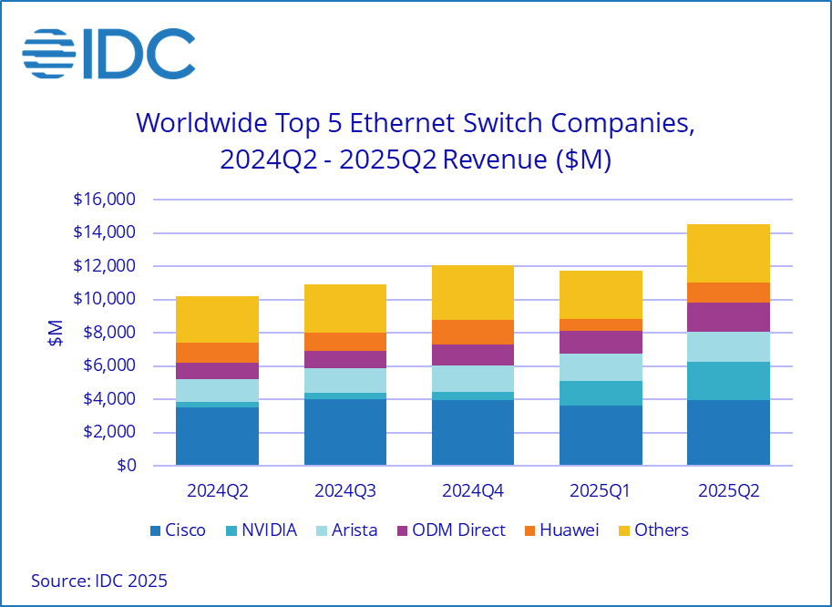 NEEDHAM, Mass., September 11, 2025 – The worldwide Ethernet switch market recorded $14.5 billion in revenue in the second quarter of 2025 (2Q25), a 42.1% year-over-year (YoY) increase, fueled by strong growth in the datacenter portion of the market as hyperscalers and cloud service providers race to build infrastructure capacity for the AI era. The total worldwide enterprise and service provider (SP) router market increased 12.5% YoY to $3.6B in 2Q25. These findings are detailed in the latest editions of the International Data Corporation ( IDC) Quarterly Ethernet Switch Tracker and IDC Quarterly Router Tracker.