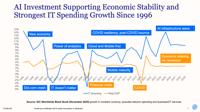 While there is much speculation about how and when this cycle may unwind, there is so far no evidence of any slowdown taking hold, and surveys continue to indicate that most businesses plan to increase IT budgets again in 2026, despite lingering anxiety around the overall economy. IDC forecasts that IT spending will increase by 10% in 2026, slower than 2025 but still representing one of the strongest years for the industry since the 1990s.