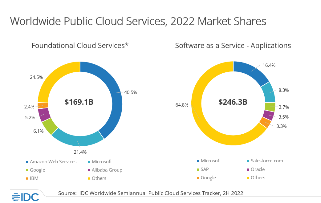 * Note: IDC defines Foundational Cloud Services as the Infrastructure as a Service (IaaS), Platform as a Service (PaaS), and Software as a Service – System Infrastructure Software (SaaS – SIS) market segments where the top eight providers (Amazon Web Services, Microsoft, Google, Alibaba Group, IBM, Salesforce, ServiceNow, and Oracle) account for the majority of the revenue and provides the foundation for cloud services in general. These include the following key service portfolios: