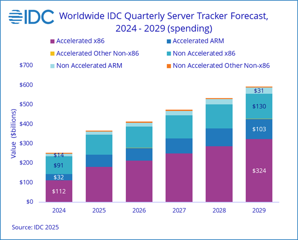 NEEDHAM, Mass., June 26, 2025 – According to the International Data Corporation (IDC) Worldwide Quarterly Server Tracker, the server market reached a record $95.2 billion dollars in market value during the first quarter of the year, showing the highest quarterly growth rate ever with 134.1% increase compared to Q1 2024. This outstanding performance pushed the market projection up for the year to a record $366.0 billion dollars for 2025 which represents a 44.6% growth compared to 2024.