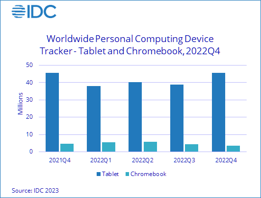 NEEDHAM, Mass., February 3, 2023 – Worldwide tablet shipments posted flat growth of 0.3% year over year in the fourth quarter of 2022 (4Q22), totaling 45.7 million units, according to preliminary data from the International Data Corporation (IDC) Worldwide Quarterly Personal Computing Device Tracker. For the full year 2022, the tablet market saw a decline of 3.3% year over year, ending two years of solid growth although shipments remain well above pre-pandemic levels. Meanwhile, Chromebook shipments continued to contract in 4Q22 with shipments totaling 3.6 million units for a year-over-year decline of 24.3%. Shipments for the full year were down 48% in 2022 after an astounding 180.5% growth in 2021.