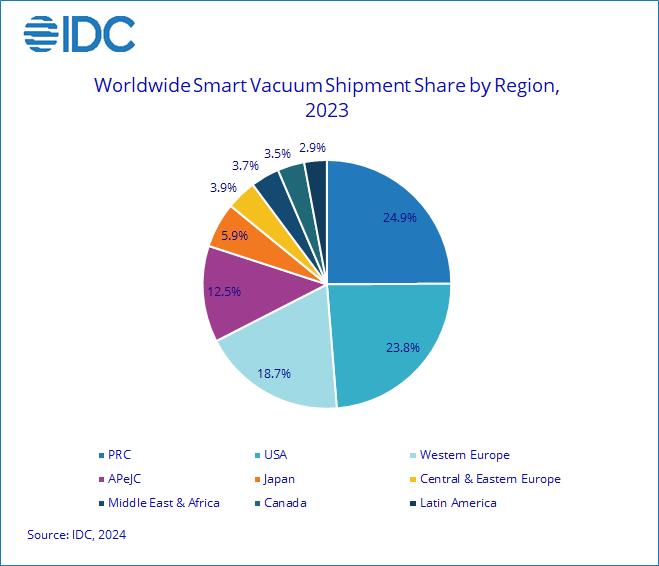 As the market surged forward, the United States and China represented roughly half the overall market, followed by Western Europe and Asia/Pacific (excluding Japan and China) (APeJC). China surpassed the U.S. to become the world’s largest market in early 2023 and ended the year with 4.6 million smart vacuums shipped. Consequentially, Chinese brands also climbed the vendor rankings as Roborock, Ecovacs, and Xiaomi were all part of the global Top 5, although iRobot maintained the leading position by a narrow margin in 2023.